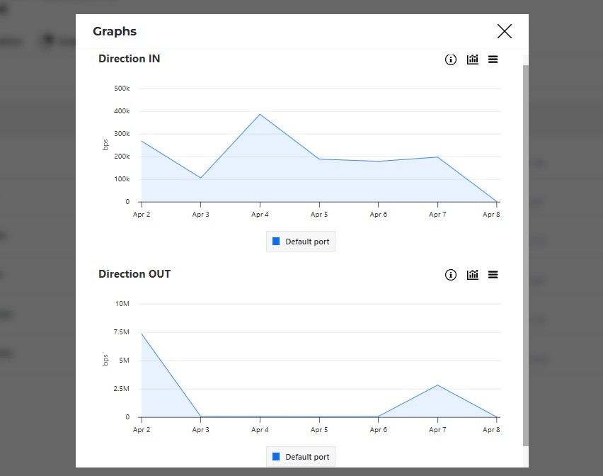 - Graphs – Data transmissions of a chosen period, listed in Mbps (Megabits per second).
