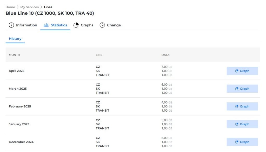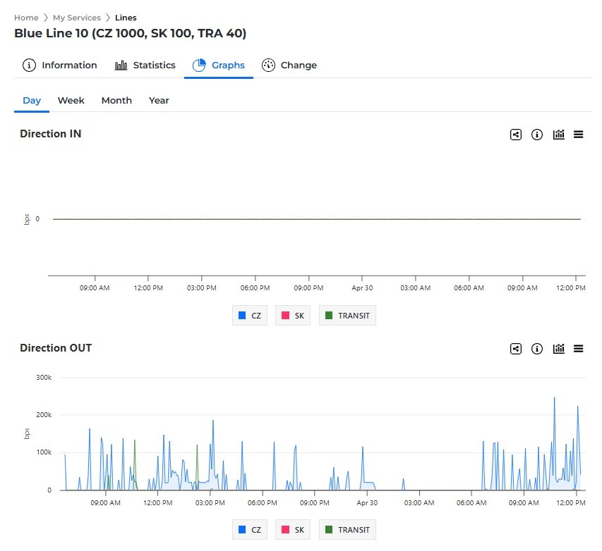 In Statistics, you will find a graph showing the data transferred during the specific month. You can filter the curves representing certain directions (CZ for the Czech Republic, SK for Slovakia, and Transit for other countries). Two graphs are always displayed, one for incoming and one for outgoing traffic, and the interval is always one day.