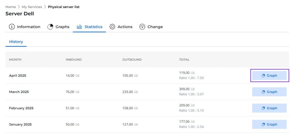 In the Graphs tab, you will find statistics of the data flowing through the server for the selected period. You can also view the statistics on a daily, weekly, monthly, or yearly basis. The daily display interval is after 5 minutes, weekly after 1 hour, monthly after 4 hours, and yearly always after days. Two curves, IN and OUT, are also shown, representing the outgoing traffic from the server.